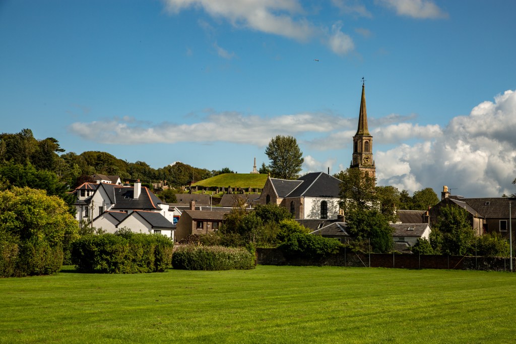 Look for the building with the mural of Strathaven and turn down into The Allison Green – Strathaven’s old Washing Green.