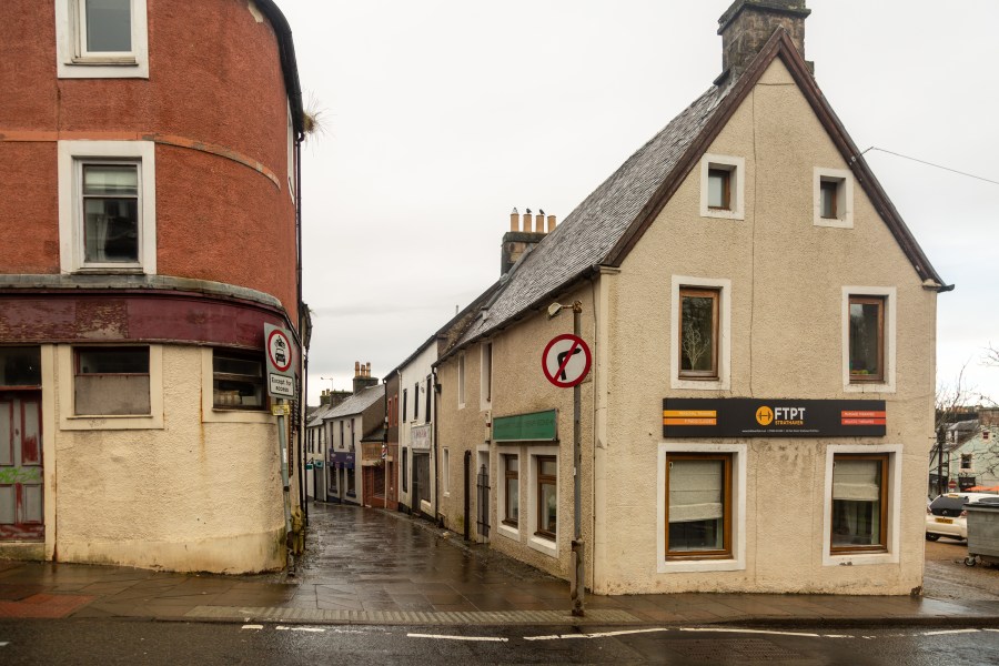 Cross Bridge Street at The Tudor Tearoom, on your left. You are at the foot of Strait Closeand Main Street, which let you see just how narrow the oldest streets in Strathaven were. Main Street used to be known as “Wide Close”!