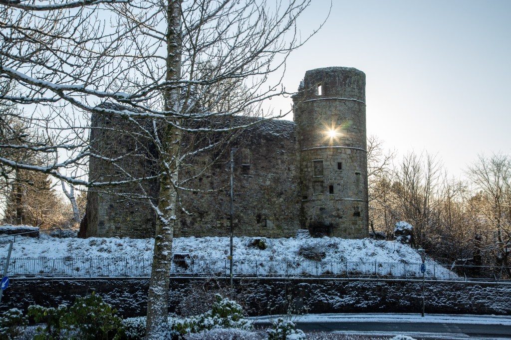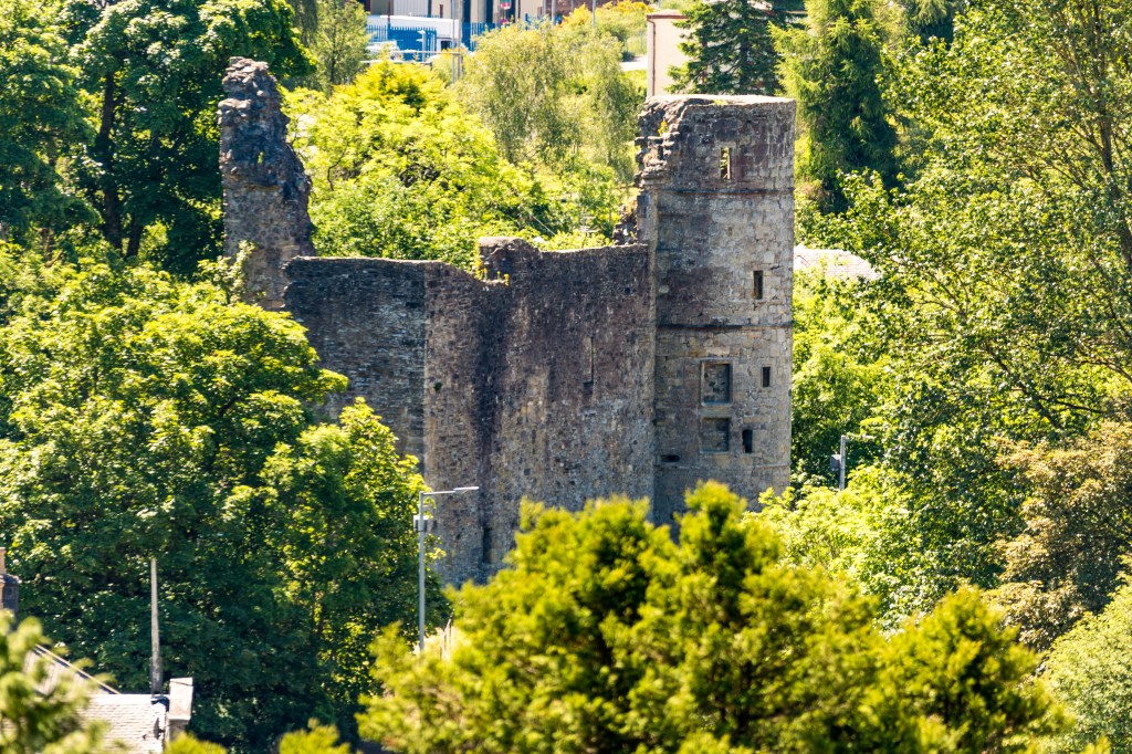Below you, you are looking down upon The Strathaven Town Mill Arts & Heritage Centre and Strathaven Castle.
