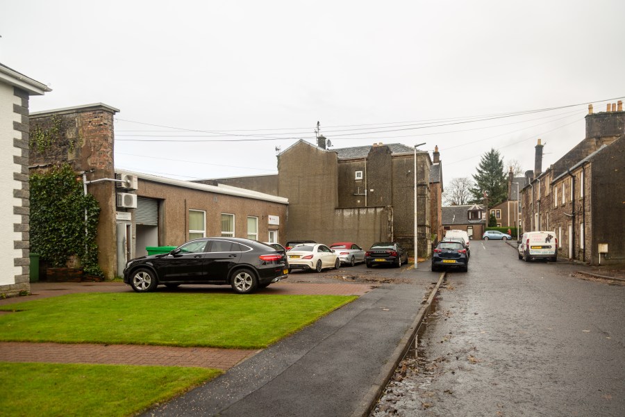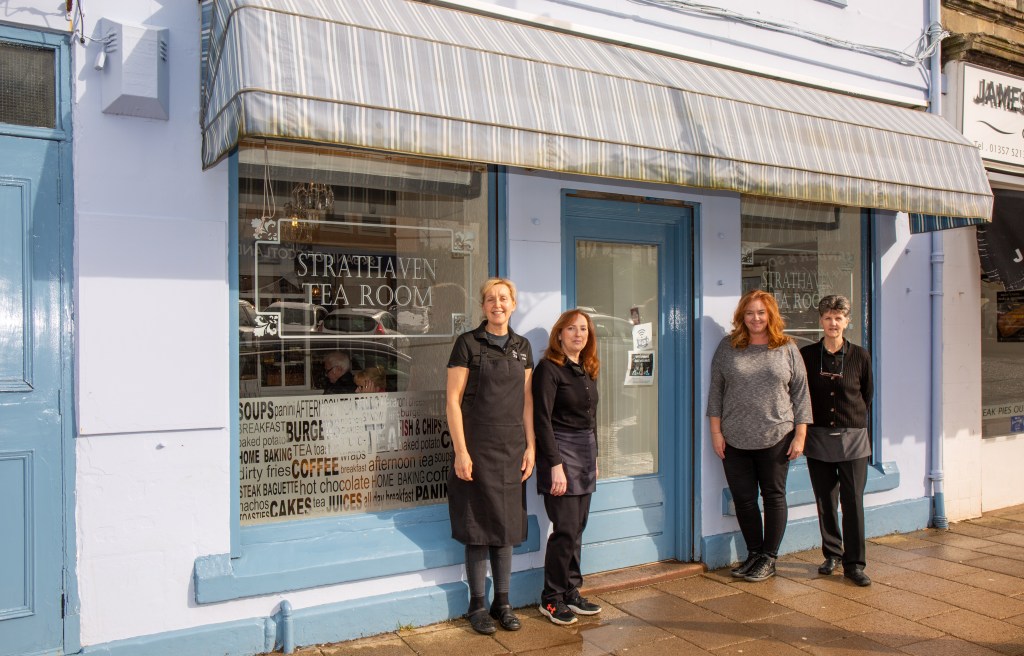 Face the Strathaven Tea Room, across The Common Green.