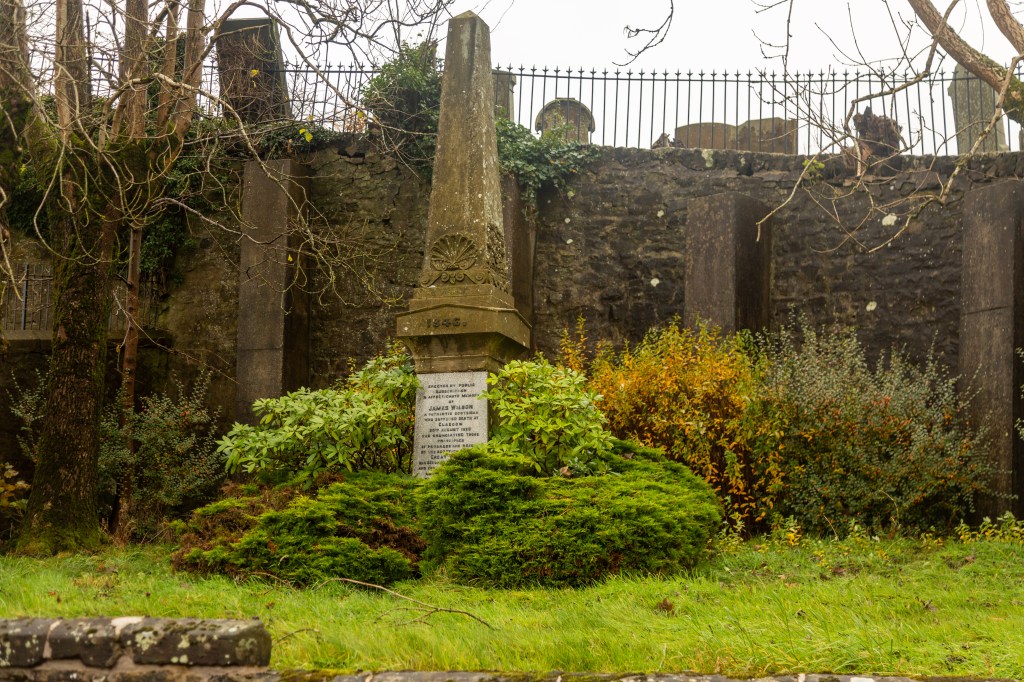Just as Castle Street begins to curve right, there’s a recess in the graveyard’s high stone wall. This was the site, marked by a monument, of the home of James “Purlie” Wilson, a much-respected Strathaven man who was executed in Glasgow in 1820 for his political opinions. You can read about him in a feature in this App. (level 1 link)